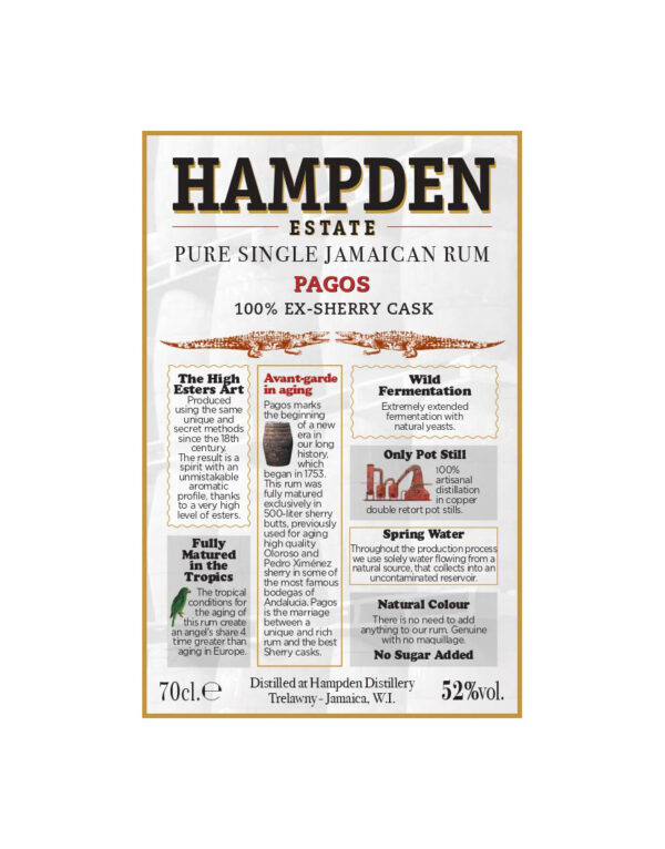Hampden Estate Pagos Sherry Cask Rum is distilled at the legendary Hampden Estate, located in Trelawny, Jamaica, that has been producing rum since around 1753. To this day the distillery has retained the traditional production methods that made the aromatic, high ester Jamaican rums famous worldwide. After more than 265 years of uninterrupted activity, Hampden, the iconic Jamaican distillery, finally launches its own bottling of aged rums on the international scene!